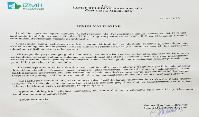 İzmit Belediye Başkanı Fatma Kaplan Hürriyet, Göztepe ile Kocaelispor arasında oynanacak müsabakada alınan deplasman yasağı kararının kaldırılması için İzmir Valiliği’ne yazılı talepte bulundu.