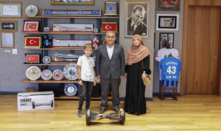 Kütahya Belediye Başkanı Alim Işık, elektrikli kaykay almak için biriktirdiği parasını depremzedeler için bağışlayan Ömer Faruk’a söz verdiği elektrikli kaykayı alarak teslim etti.