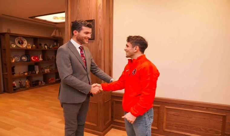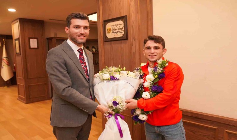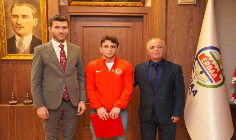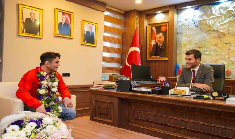 Erbaa Belediye Başkanı Ertuğrul Karagöl Azerbaycan’da düzenlenen Ordulararası Serbest Güreş Şampiyonası’nda Dünya Şampiyonu olan Ahmet Duman’ı tebrik ederek hediye takdim etti.