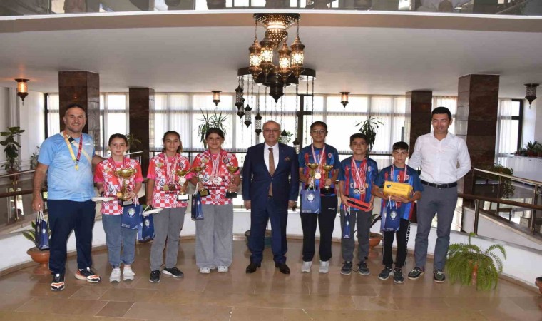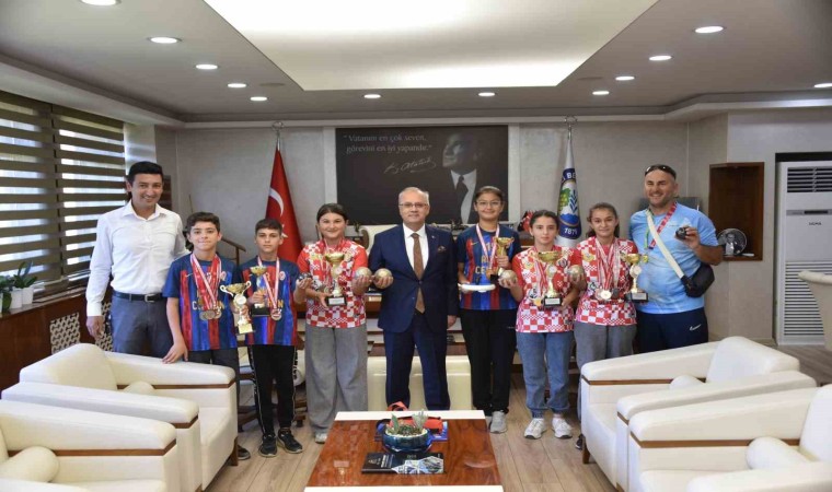 Salihli Belediye Başkanı Zeki Kayda, Mersin’de düzenlenen Bocce Volo Atış Oyunları Türkiye Şampiyonası’nda madalya kazanan Durasıllı Mimar Sinan Ortaokulu’nun şampiyon öğrencilerini makamında ağırladı.