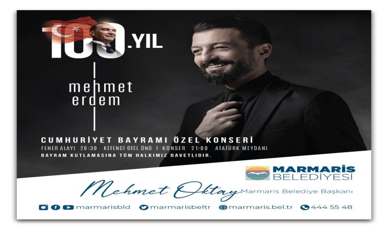 Marmaris Belediye Başkanı Mehmet Oktay, Cumhuriyet’in kuruluşunun 100. Yılını ve tüm vatandaşların Cumhuriyet Bayramını kutladı. Başkan Oktay, “Tüm halkımızı Cumhuriyet Bayramı’nı coşkuyla kutlayacağımız fener alayı ve Mehmet Erdem konserine bekliyoruz” dedi.