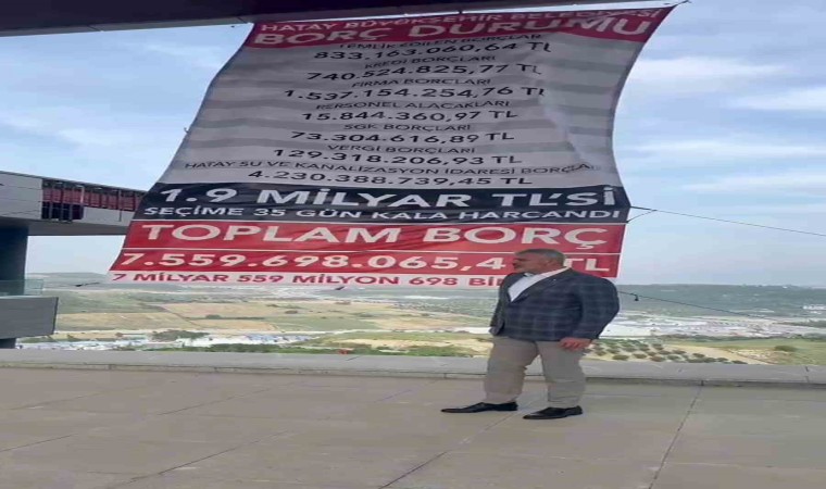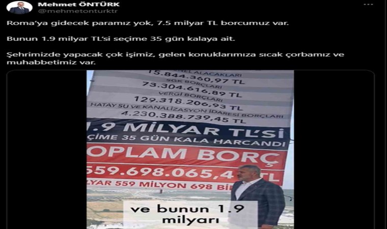 Hatay Büyükşehir Belediyesi, 31 Mart öncesindeki borç durumunun yer aldığı afişi Antakya ilçesi EXPO alanı içerisinde bulunan ve belediye başkanlığı makamının yer aldığı binaya astı. CHP’li Lütfü Savaş’tan devralınan 7 milyar 559 milyon TL borcun yer aldığı görsel, belediyeye ait sosyal medya hesaplarından da paylaşıldı. Paylaşılan borç görseli depremzede vatandaşlardan tepki gördü. Öte yandan Başkan Öntürk, borç çizelgesinin yer aldığı afişin önünde çekilen görüntülerle geçtiğimiz gün 45 basın mensubuyla Roma gezisine giden İstanbul Büyükşehir Belediye Başkanı Ekrem İmamoğlu’na göndermede bulundu.