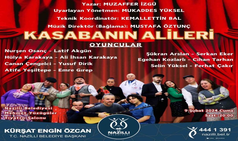 Nazilli Belediye Başkanı Kürşat Engin Özcan, Nazilli Belediyesi Tiyatro Topluluğu’nun hazırladığı Kasabanın Alileri adlı oyuna tüm sanatseverleri davet etti.