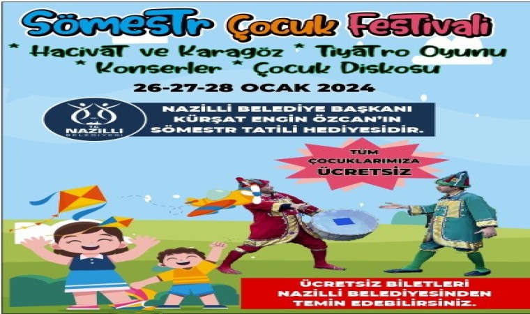 Nazilli Belediyesi, 26-27-28 Ocak tarihlerinde gerçekleşecek Sömestr Çocuk Festivali’nde Hacivat ve Karagöz, çocuk diskosu, tiyatro ve konser etkinliklerini öğrencilerle buluşturuyor. Tüm velilerin Sömestr Çocuk Festivali biletlerini ücretsiz olarak Belediye Hizmet Binası giriş katından temin edebileceğini dile getiren Belediye Başkanı Kürşat Engin Özcan, “Kıymetli evlatlarımız uzun bir dönem boyunca çalıştılar, alın teri döktüler. Şimdi dinlenme ve eğlenme zamanı. Bizler de Nazilli Belediyesi olarak çocuklarımızın eğlenirken öğrenebileceği güzel bir festival programı hazırladık. Velilerimiz biletleri belediyemizden ücretsiz olarak alabilirler. Geleceğimizin teminatı, yarınlarımızın umudu güzel evlatlarıma şimdiden iyi tatiller diliyorum” dedi.