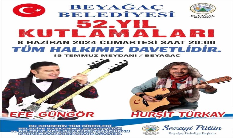 Beyağaç Belediyesi, belediyenin 52. kuruluş yıldönümü nedeniyle, 8 Haziran Cumartesi günü saat 20.00’de 15 Temmuz Meydanı’nda saat yerel sanatçılar Efe Güngör ve Hurşit Türkay’ın sahne alacağı konser düzenleyecek. Devir aldıkları ekonomik durum nedeniyle etkinliklerde belediye bütçesinden harcama yapmayacaklarını açıklayan Belediye Başkanı Sezayi Pütün, kuruluş yıldönümü etkinlik giderlerinin tamamını meclis üyeleri ile birlikte kendisinin karşılayacağını ifade etti.