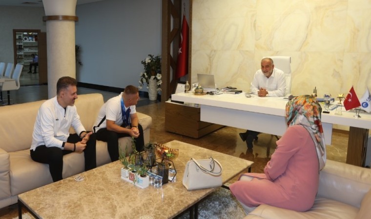 Canik Belediye Başkanı İbrahim Sandıkçı, kariyerinde olimpiyat ve dünya şampiyonlukları da bulunan ve Down Sendromlular Avrupa Şampiyonası’nda 3’üncü kez Avrupa şampiyonluğunu göğüsleyen Canik Belediyespor Kulübü milli sporcu Ali Topaloğlu’nu makamında ağırlayarak, başarılarından dolayı kutladı. Canik’te çocukları ve gençleri ilgi alanlarına göre spor branşlarıyla buluşturmaya devam ettiklerini belirten Başkan İbrahim Sandıkçı, “İlçemizde her yaş grubundan çocuk ve gencimizi ilgili alanlarına göre belirledikleri spor branşlarıyla buluşturmaya devam ediyoruz. Kendilerini sportif etkinlikler ve eğitimlerle bir araya getirerek zihinsel ve bedensel gelişimlerine katkı sunuyoruz. Farklı spor branşlarında yeteneklerini keşfetmelerine vesile olduğumuz nesillerimizin ilgi duyduğu spor branşlarını profesyonel olarak icra etmelerini sağlarken aynı zamanda milli takımlarımıza yeni sporcular kazandırmaya devam ediyoruz. Sporcularımız bireysel ve takım sporlarında başarıdan başarıya koşmaya devam ediyor. Canikli milli sporcumuz Ali Topaloğlu, Avrupa şampiyonasında gösterdiği üstün performansla şampiyon olarak bizleri yeniden gururlandırdı. Canikli milli sporcumuz Ali Topaloğlu’nu bir kez daha yürekten tebrik ediyor, sporcumuzun yetişmesinde katkılarda bulunan ailesine, antrenörlerimize ve emeği geçen herkese çok teşekkür ediyorum. Başarıları daim olsun” diye konuştu.