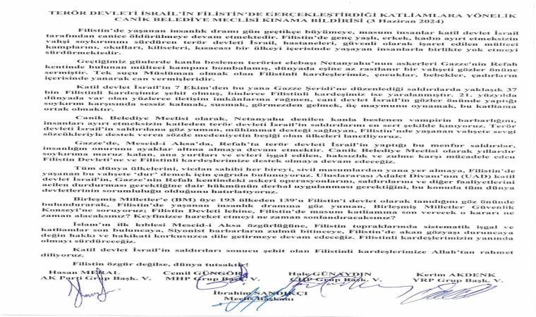 Canik Belediye Meclisi, haziran ayı açılış toplantında tüm siyasi partilerin grup başkan vekillerinin imzasıyla yayımlanan ortak bildiride, İsrail’in son dönemde Gazze Şeridi ve Refah kentine yönelik yoğun saldırılarla Filistin’de soykırım yapmaya devam ettiği vurgulandı.