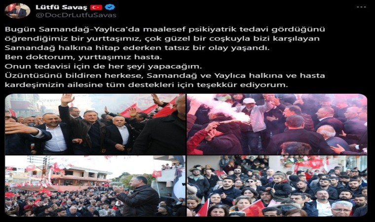 Başkan Savaş’ın şefkat elini uzattığı şahsın yakını da sosyal medya üzerinden yaptığı paylaşımda, "Herkese iyi günler. Bugün Sayın Lütfü Savaş’a yapılan üzücü bir olay olmuştur ama bu saldırı kesinlikle planlı değildir maalesef ki kendisi dayım olur ve psikolojik sorunları vardır. Özetle hasta bir bireydir ve mevsim geçişlerinde artan bir hastalıktır" dedi.