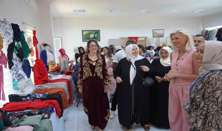 Bilecik Belediye Başkanı Melek Mızrak Subaşı, dikiş kursu sergisinin açılışında hediye edilen ‘Melek Şef’ yazılı önlüğü taktı.