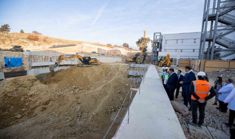 Türkiye’nin ilk ve tek belediye hastanesi İzmir Büyükşehir Belediyesi Eşrefpaşa Hastanesi, hastalarına daha kaliteli hizmet vermek amacıyla çalışmalarına devam ediyor. Yeni ek hizmet binasının inşaatı hızla yükselirken, İzmir Büyükşehir Belediye Başkanı Dr. Cemil Tugay hem çalışmaları yerinde incelemek hem de göreve yeni gelen Başhekim Doç. Dr. Başak Bayram’ı tebrik etmek amacıyla Eşrefpaşa Hastanesi’ni ziyaret etti. Başhekim Bayram’la mevcut sağlık hizmetlerini değerlendiren Başkan Tugay, sağlık alanında yapılması planlanan projeler hakkında da görüştü. Hastane ziyaretinde İzmir Büyükşehir Belediyesi Genel Sekreter Yardımcısı Prof. Dr. Pınar Okyay, Genel Sekreter Yardımcısı Çağatay Güç, Sağlık İşleri Dairesi Başkanı Ahmet Soner Emre, Yapı İşleri Dairesi Başkanı Onur Açık ve hastane yöneticileri yer aldı.