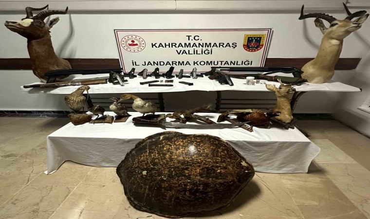 Kahramanmaraş İl Jandarma Komutanlığı ekiplerince bir adrese düzenlenen operasyonda çok sayıda silah ve bazı hayvanlara ait tahnitler ele geçirildi.