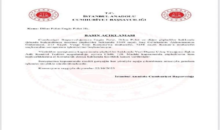 Oğuzhan UYSAL/İSTANBUL, (DHA) - ANADOLU Cumhuriyet Başsavcılığı Dilan Polat ve Engin Polat soruşturması hakkında basın açıklaması yaptı. Açıklamada Dilan Polat, Engin Polat ve diğer şüpheliler hakkında soruşturma başlatıldığı, soruşturma kapsamında şüpheliler hakkında yurtdışı çıkış yasağı uygulandığı ve şüphelilerin tüm mal varlıklarına el konularak dosya hakkında kısıtlılık kararı verildiği açıklandı.