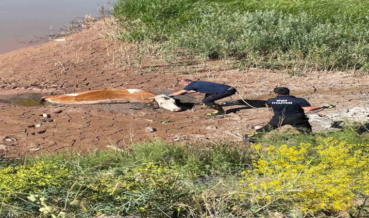 Sivas’ta bataklığa saplanan ineği itfaiye ekipleri kurtardı.