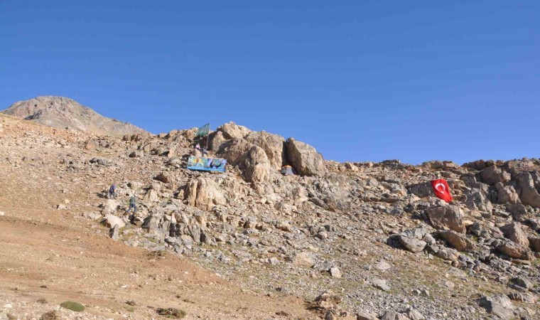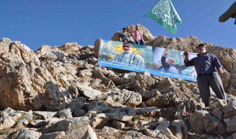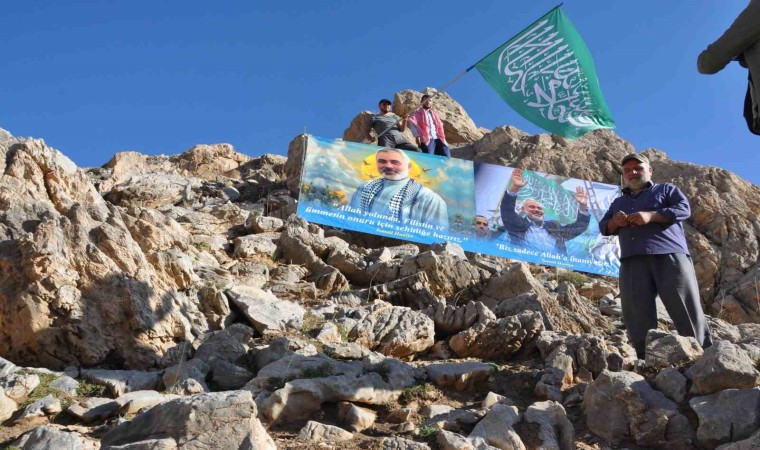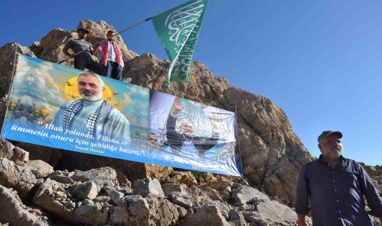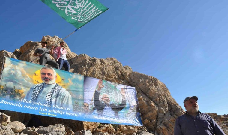 Batman’da 3 bin rakımlı Mereto Dağının zirvesine tırmanan bir grup vatandaş, zirvede İsrail tarafından düzenlenen suikast sonucu şehit edilen Hamas’ın siyasi lideri İsmail Haniye’nin posterini ve Kelime-i Tevhid bayrağı açtı.