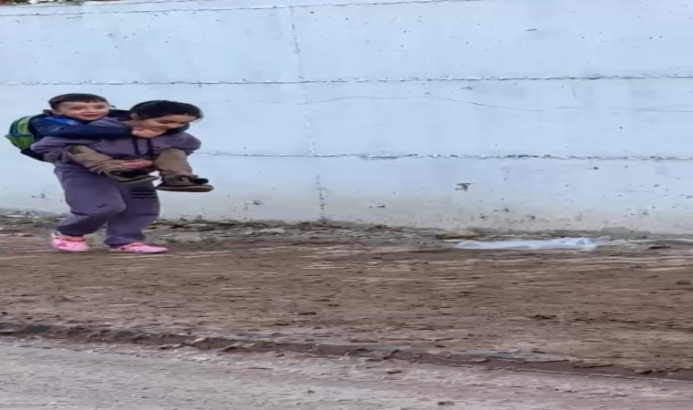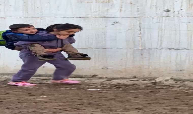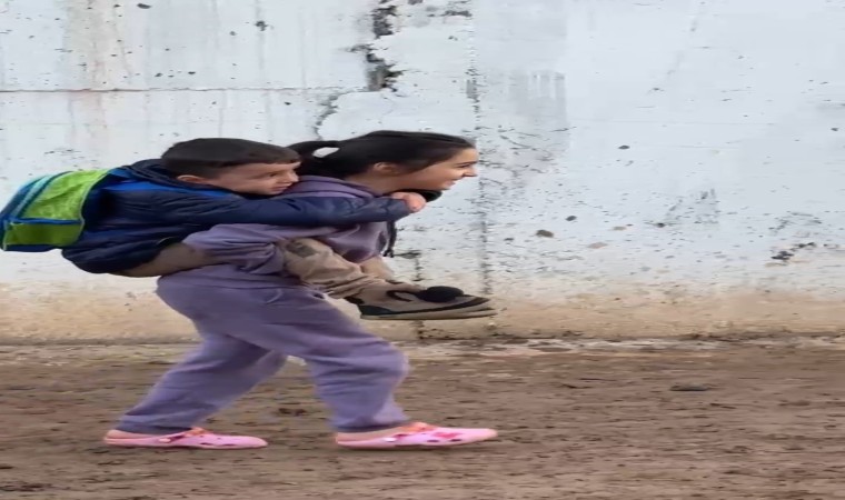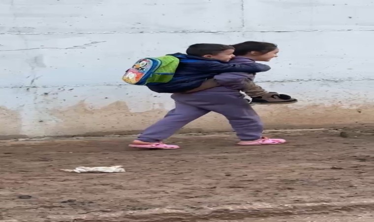 Batman’da vefakar abla, cadde ve sokakların çamur olmasından dolayı kardeşini sırtında taşıyarak okula götürdü. O anlar bir vatandaşın cep telefonu kamerasına yansıdı.