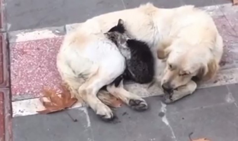 Batman’da soğukta üşüyen yavru kedi, köpeğin kucağında ısınmaya çalıştı.