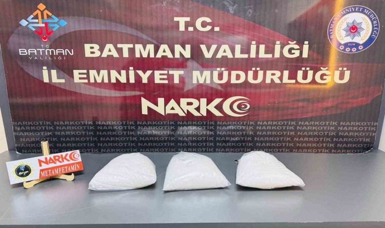 Batman İl Emniyet Müdürlüğü Narkotik Suçlarla Mücadele Şube Müdürlüğü ekiplerince kent girişinde şüphelenilen bir tır durdurularak arama yapıldı. Hassas burunlu narkotik köpeğinin tepki verdiği yeri kontrol eden polisler, çantada 3 poşet içinde 3 kilo 50 gram metafetamin ele geçirdi. Gözaltına alınan 1 kişi, emniyetteki işlemlerinin ardından çıkarıldığı mahkemece tutuklanarak cezaevine gönderildi.