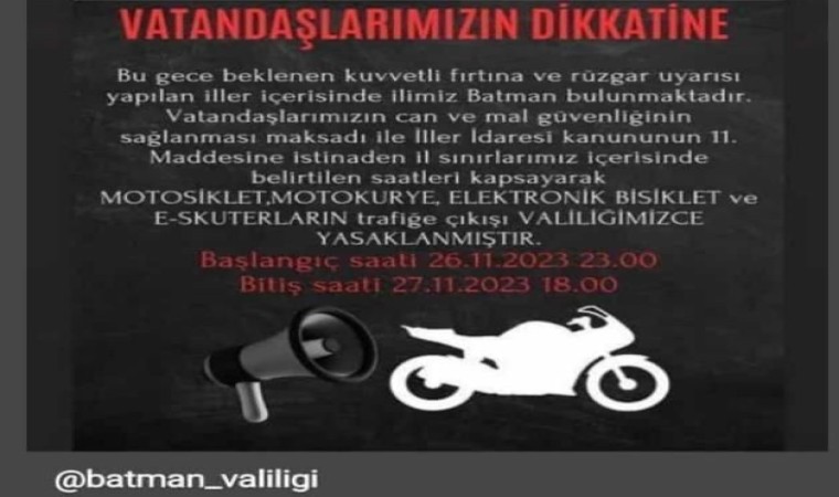 Batman Valiliği ayrıca, vatandaşların can ve mal güvenliğinin sağlanması amacıyla İller İdaresi’nin 5442 Sayılı Kanunu’nun 11. maddesi kapsamında bu gece saat 23.00’den yarın saat 18.00’e kadar motosiklet, motokurye, elektronik bisiklet ve elektrikli skuterların trafiğe çıkmasını yasakladı. Kentin farklı noktalarında acil müdahale için iş makinaları da hazır bekletiliyor.