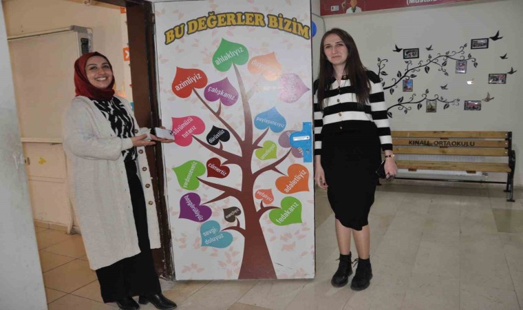 Öğrencilerinin gündelik hayatta karşılaşabilecekleri önemli bilgilere daha fazla karşılaşmalarını sağlamak ve zihinlerine kazımaları için yazı ve görsellerle okuldaki bütün sınıf, lavabo ve tuvaletlerin kapılarını adete bir kitap gibi bilgi ve görsellerle donattıklarını belirten Kınalı İlk ve Ortaokulu Müdürü Selçuk Sağlam, yapılan çalışmalarla kapıların görselliğiyle de sınıf ve koridora ayrı bir renk kattığını söyledi.