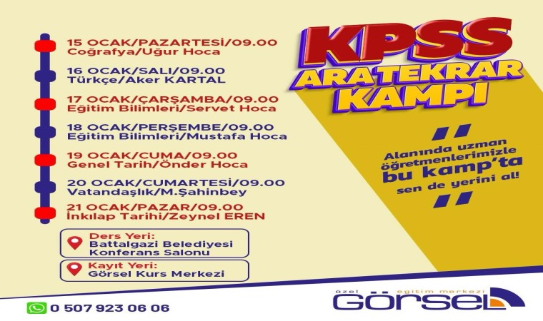 Eğitim konusunda destekleriyle ön plana çıkan Battalgazi Belediye Başkanı Osman Güder’in talimatları kapsamında, Battalgazi Belediyesi tarafından 15-21 Ocak tarihleri arasında KPSS’ye (Kamu Personeli Seçme Sınavı) hazırlanan vatandaşlar için genel yetenek, genel kültür ve eğitim bilimleri alanlarında ara tekrar kampı yapılacak. Ünlü Türkçe öğretmeni Aker Kartal’ın ve Görsel Eğitim Kurumları öğretmenlerinin katılımıyla ücretsiz olarak gerçekleşecek kamp, 15 Ocak günü saat 09:00’da Battalgazi Belediyesi Konferans Salonu’nda start verecek.