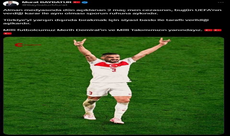 UEFA’nın almış olduğu kararın siyasi baskı sonucu alındığını ve taraflı olduğunu dile getiren Baybatur, paylaşımında şu ifadelere yer verdi: "Alman medyasında dün açıklanan 2 maç men cezasının, bugün UEFA’nın verdiği karar ile aynı olması sporun ruhuna aykırıdır. Türkiye’yi yarışın dışında bırakmak için siyasi baskı ile taraflı verildiği aşikardır. Milli futbolcumuz Merih Demiral’ın ve Milli Takımımızın yanındayız."