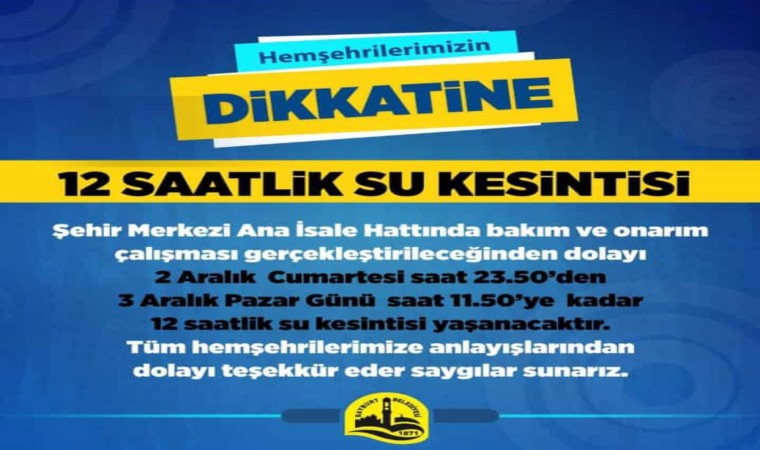 Bayburt Belediyesinden yapılan yazılı uyarıda şu ifadeler yer aldı: “Şehir merkezi ana isale su hattında bakım ve onarım çalışması gerçekleştirileceğinden dolayı 2 Aralık Cumartesi günü gece saat 23.50‘den, 3 Aralık Pazar günü saat 11.50’ye kadar şehir merkezinde 12 saatlik su kesintisi yaşanacaktır. Tüm hemşehrilerimize anlayışları için teşekkür eder saygılar sunarız.”