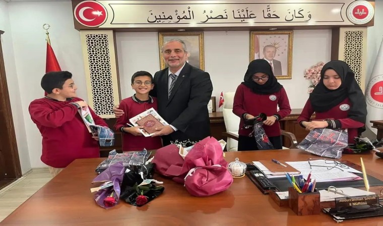 Okul öğretmenleri Şener Kansoy, Reyhan Camadan ve öğrencileriyle birlikte ziyareti gerçekleştiren Kacır, tüm müftülük personeline gül dağıtarak Camiler ve Din Görevlileri haftasını kutladı.