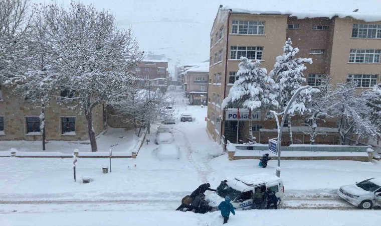 Bayburt’ta dün başlayan kar nedeniyle kent merkezi kara teslim olurken, şehrin en işlek caddesi olan Cumhuriyet Caddesi’nde ulaşım durma noktasına geldi. İlerlemekte güçlük çeken sürücülerin yardımına koşan polis ekipleri gözetiminde ulaşım kontrollü sağlanırken, sürücülere yardımcı olan ve geceden beri yoğun mesai içerisinde bulunan bir devriye aracı da polisevi önünde kara saplandı. Polis aracına etraftaki vatandaşlar yardım ederek, araç saplandığı yerden çıkarıldı. Öte yandan bu denli kar yağacağını hesaba katmayan sürücüler, yazlık lastiklerle mağduriyet yaşadılar. Apar topar oto lastikçilerin yolunu tutan sürücüler, kışlık lastik taktırmak için lastikçiler önlerinde beklemeye başladılar.
