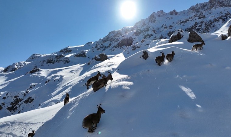 Yüksek ve kayalık alanları kendilerine mekân tutan dağ keçileri dağlara renk katıyor. Sürüler halinde görüntülenen dağ keçileri, karlar üzerinde bir süre gezinip gözden kayboldu.