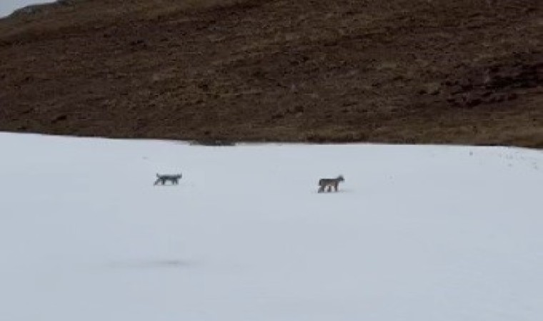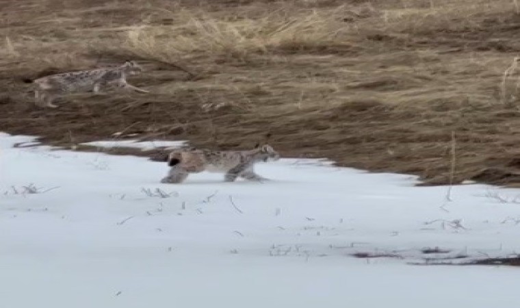Bayburt’ta nesli tükenme tehlikesi altında olan iki vaşak, karla kaplı arazide görüntülendi.