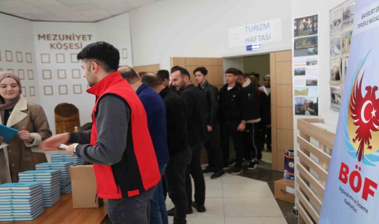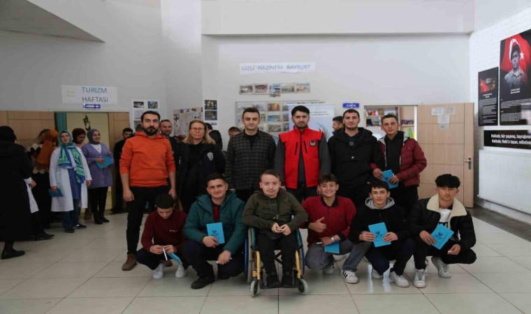 Bayburt’ta eğitim gören lise öğrencilerinin terör faaliyetlerinden uzak tutulması, terörle mücadelede halk desteğinin alınarak, gelişen olaylara karşı daha dikkatli olunmasını sağlamak amacıyla TEM şube müdürlüğü ekiplerince, Ahi Evran Mesleki ve Teknik Anadolu Lisesi konferans salonunda 150 öğrenciye bilgilendirme faaliyeti yapıldı. Ülkenin birlik ve bütünlüğünü bozmaya çalışan terör örgütlerinin propaganda faaliyetleri ile eylemlerine karşı öğrencileri uyaran ekipler, bilgilendirme faaliyetinin sonunda öğrencilere el broşürleri, ajanda, defter ve kalem hediye etti.