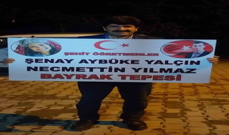 Erzurum’un Tortum ilçesine bağlı Bağbaşı Mahallesi’nde, "Bayrak Adam" lakabıyla tanınan Feyzullah Coşkun, mahallede gördüğü her tepeye bayrak dikme geleneğini sürdürüyor. Coşkun, Bağbaşı sakinlerinin desteğiyle dördüncü büyük bayrağını da bir tepeye dikerek, bu bayrağı Şehit Öğretmenler Şenay Aybüke Yalçın ve Necmettin Yılmaz anısına adadı. Tepeye, şehit öğretmenlerin isimleri verildi.