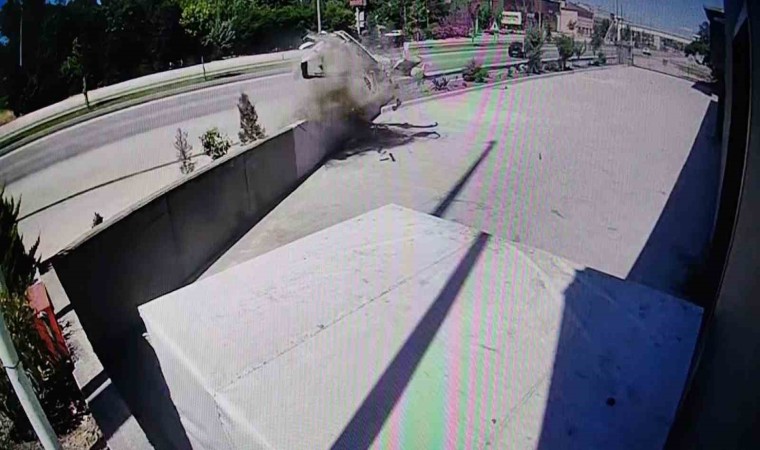 Kaza anı bir iş yerinin güvenlik kamerasına saniye saniye yansıdı. Görüntülerde aracın duvara çarpıp fabrika bahçesine uçtuğu, yaralıların araçtan fırladığı, araçta da yangın çıktığı görüldü.