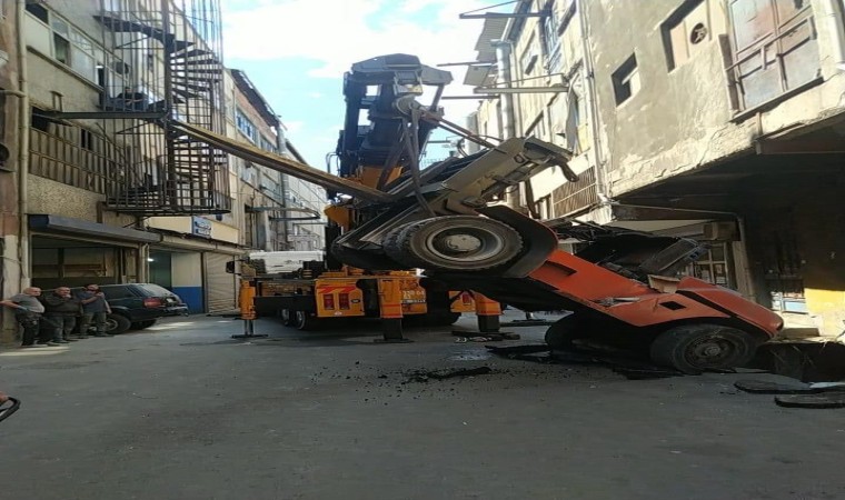 Bayrampaşa’da bir sanayi sitesinde yol bilinmeyen bir sebeple çöktü. Çöken yolun çukuruna düşen forklift’in vinç yardımıyla çıkarıldığı o anlar cep telefonu kamerası ile kaydedildi.