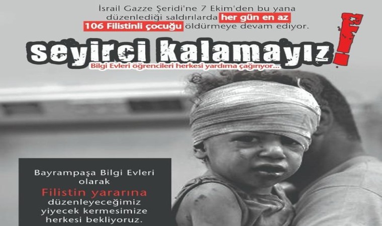 Bayrampaşa Belediyesi Bilgi Evleri öğrencileri, Gazzeli çocuklar için ‘seyirci kalamayız’ temasıyla yardım programı düzenleyecek. 13 Ocak Cumartesi günü İsmetpaşa Mahallesi Bilgi Evi’nde düzenlenecek etkinlikten elde edilecek gelirin tamamı Gazzeli yetim ve öksüz çocuklara bağışlanacak. Öğrenciler, duyarlı herkesi programa katılmaya ve destek vermeye davet ediyor.