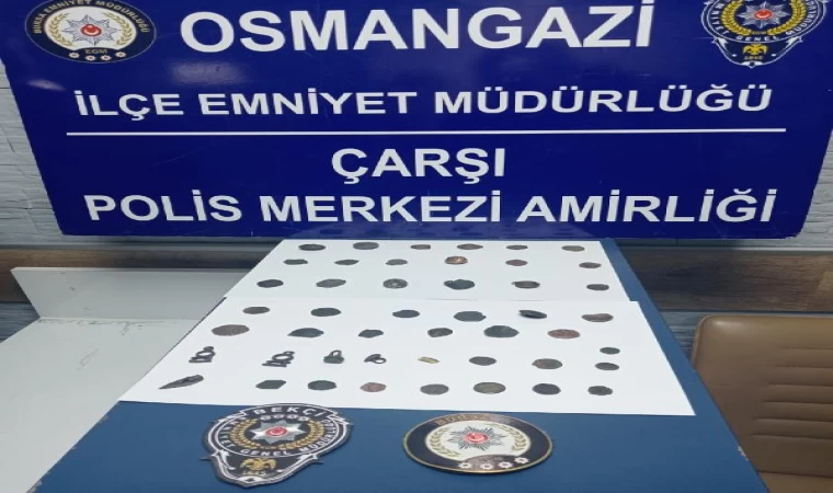 Olay, saat 03.00 sıralarında Osmangazi ilçesi Tuz Pazarı Mahallesi'nde meydana geldi. Haşim İşcan Caddesi'nde devriye görevi yapan çarşı ve mahalle bekçileri, yolda yürüyen E.Ü.'yü şüphe üzerine durdurdu. GBT sorgusu yapan ekipler, E.Ü.'nün 'hırsızlık' ve 'uyuşturucu' suçlarından 10 farklı kaydının bulunduğunu belirledi. Bu sırada şüphelinin montunun cebindeki kabarıklığı fark edip, üst araması yapan ekipler, plastik kutu içerisine saklanmış halde 47 adet sikke ve obje olduğunu gördü. Tarihi eser niteliği taşıdığı düşünülen sikke ve objelere el konulurken, şüpheli polis merkezine götürüldü. E.Ü. işlemleri sonrası adliyeye sevk edildi. (DHA)