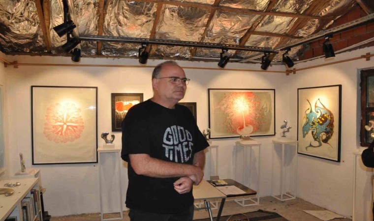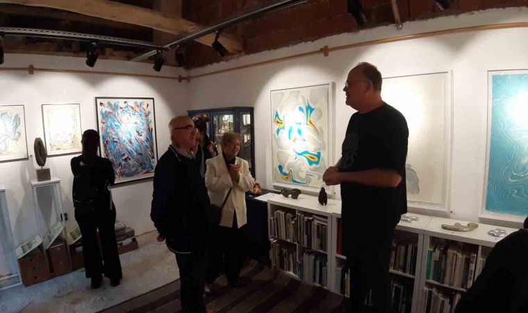 10 yıl önce ebru sanatı ile tanıştığını belirten Jeroen Yasin Demoen, “10 sene önce ebru sanatı ile tanıştım, aslında Belçikalıyım. 30 seneden beri Türkiye’deyim. Belçika’da güzel sanatlar okudum, böyle bir sanat bilmiyordum. Sonradan bir başladım resim yapmaya, çok güzel özgürlük veriyor insana, insan rahat hissediyor kendini. İlk defa geleneksel ebruları öğrendim, baktım bunlarla doyamıyorum, daha çok istiyorum. Bundan sonra eski tip ebruların 16. yüzyıllarda kullanılan segmentlerini öğrenmeye başladım. Onlara merak sardım, suyun hareketlerini çok seviyorum. Bu ebru sanatını yapanlar hep oturarak çalışma yapıyorlar, hareket ettirmiyorlar. Ben de aksine hareket ettirerek çalışma yapıyorum, gerekirse üflüyorum, gerekirse saç kurutma makinesi ile dalgalandırıyorum suyu, ondan sonra farklı eserler çıkıyor ortaya. Canlı renkleri seviyorum. Daha sonra heykele başladım, bir alüminyum parça vardı, onu kesmeye başladım, ondan sonra devam ettim. Alüminyum heykellerin var, onları kesmeden yaptım. Eşim Türk olduğu için Türkçeyi ondan rahatlıkla öğrendim, rahat kullanabiliyorum. Türk vatandaşı olarak adım Yasin, buraya gelince Mudurnu’da taşları kullandım. Burada kapanmış bir taş ocağı var, oradan birkaç parça ile bir şeyler yapmaya çalıştım. Malzemelerle doğaya zarar vermeden çalışmak istiyorum” dedi.