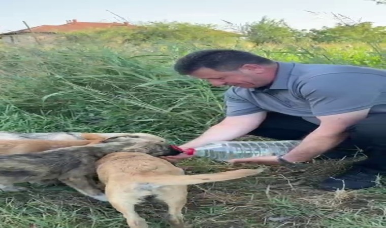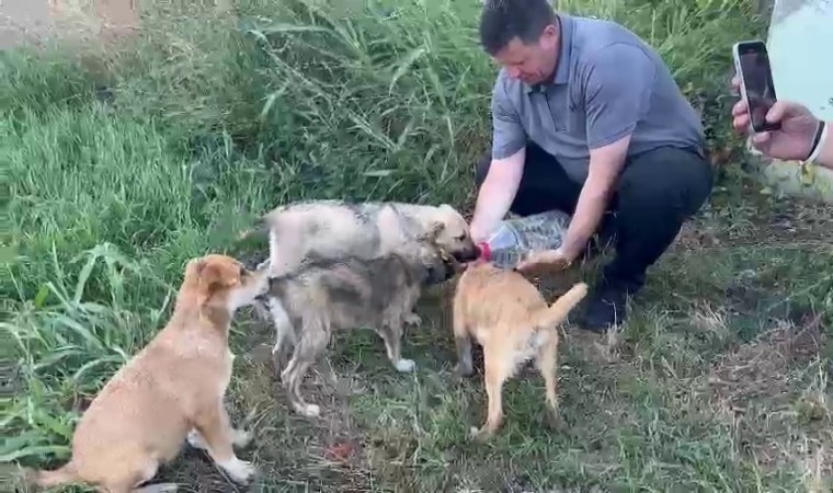 Sakarya’da Akyazı Belediye Başkanı Bilal Soykan, sıcaktan bitap düşen ve anneleri olmayan yavru sokak köpeklerine elleriyle su içirdi.