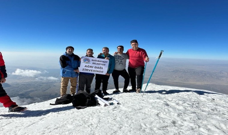 Doğubayazıt Belediyesine bağlı personeller , 5 bin 137 metrelik yüksekliğiyle Türkiye’nin en büyük dağı be aynı zamanda üzerinde 10 kilometrekarelik buz takkesi bulunduran Ağrı Dağı’na tırmandı. Zor hava koşullarına rağmen zirveyi tamamlayan personeller Doğubayazıt Belediyesi yazan bir pankartı açtı.