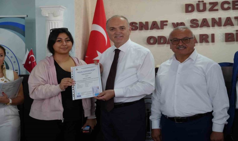 Başkan Özlü yaptığı konuşmada, “Esnaf odalarının, ticaretin ve esnafların gelişmesi noktasında yapmış olduğu çalışmalardan birine daha bugün şahitlik ediyoruz. Kurslar düzenlenmesi ve esnafın sertifiye edilmesi son derece önemli. Bu önemli görevi icra eden esnaf odalarımıza teşekkür ediyorum. Düzce Belediyesi her zaman sizlerin, esnafın yanında olacak. Ne yapıyorsak sizlerle beraber yapacağız. Çünkü bizim yaptığımız her şey sizler için, Düzce’de yaşayanlar için. Sizler sahiplenirseniz, sizler koruyup kollarsanız yapılan işlere sahip çıkarsanız bunlar kalıcı ve sürdürülebilir olur” ifadelerini kullandı.