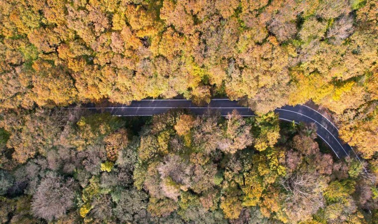 Sonbaharın gelmesiyle dökülmüş sararan yapraklar yolları süslerken, görenlerin hayranlıkla bakacağı manzara havadan görüntülendi.