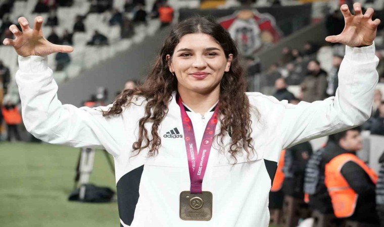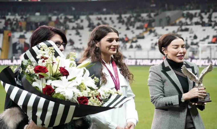 Beşiktaş Kulübü İletişimden Sorumlu Yönetim Kurulu Üyesi Işıl Zeybek, Avrupa Güreş Şampiyonası kadınlar 72 kiloda altın madalya kazanan Nesrin Baş’a plaket verdi.