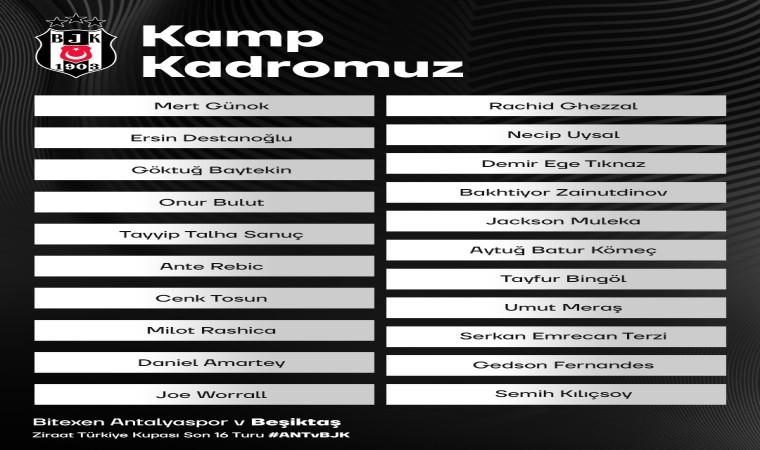 Ziraat Türkiye Kupası Son 16 Turu’nda deplasmanda Antalyaspor ile karşılaşacak Beşiktaş’ın kamp kadrosu belli oldu. Siyah-beyazlıların yeni transferi Joe Worrall da kadroda yer aldı.
