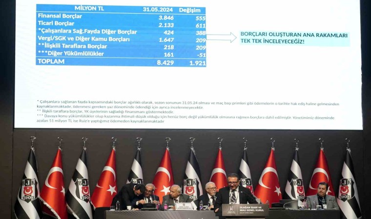 Beşiktaş Kulübü’nün Olağan İdari ve Mali Genel Kurul Toplantısı, İstanbul Kongre Merkezi Harbiye Oditoryumu’nda devam ediyor. Beşiktaş Kulübü Genel Sekreteri Kaan Şakul, divan üyelerine mali konularda bilgi verdi. Şakul, siyah-beyazlı kulübün borcunun 31 Mayıs 2024 itibariyle 8 milyar 429 milyon TL olduğunu açıkladı.