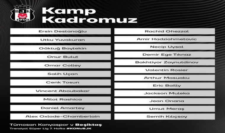 Beşiktaş’ın Konyaspor maçı kamp kadrosunda şu isimler yer alıyor:
