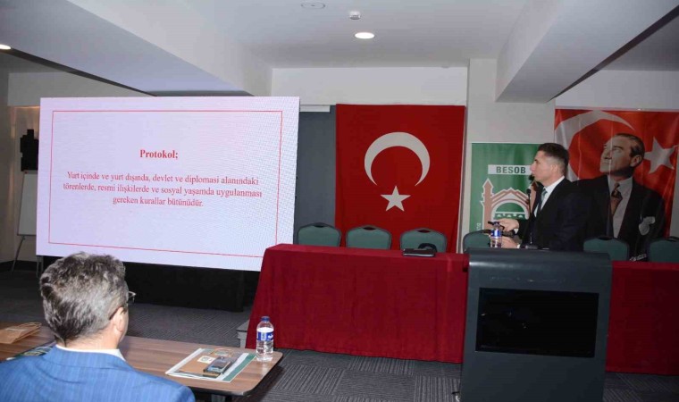 Protokol Kuralları ve Kamuda Uygulama Alanları konulu eğitimde sunum yapan Fatih Arslan, protokolün tanımı, önde gelim-öncelik hakkı, protokolün uygulama alanları, düzen, nezaket, saygı ve modern adabı muaşeret kuralları hakkında bilgiler verdi.