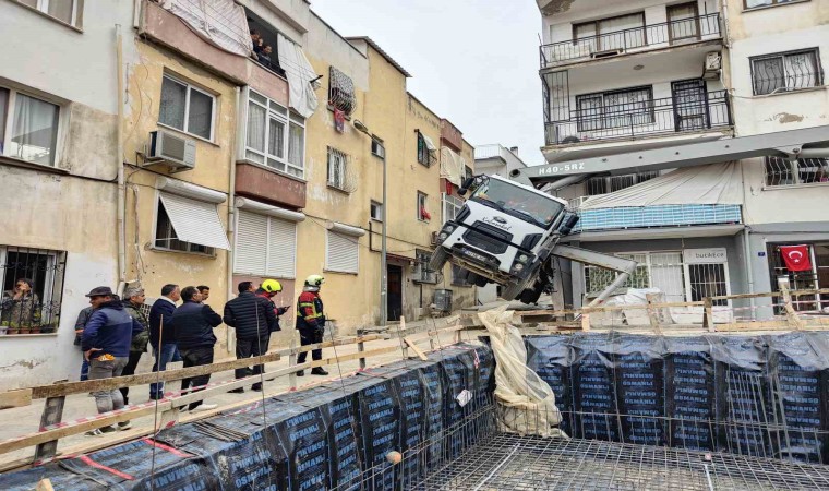 Aydın’ın Kuşadası ilçesinde, inşaat çalışması sırasında beton dökme aracı, sabitleme ayaklarından 3’ü açılmayınca yan yatarak şaha kalktı. İnşaat temeli ile yol arasında askıda kalan aracın 20 metrelik kolunun bir kısmı da yan tarafta bulunan bir apartmana zarar verdi.
