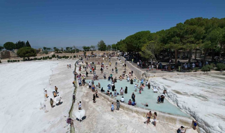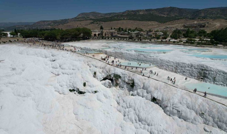 UNESCO’nun Dünya Mirası Listesi’nde yer alan beyaz cennet Pamukkale dünyaca ünlü travertenleri yurt içi ve dışından milyonlarca kişiyi ağırlamaya devam ediyor. Geçtiğimiz 2022 senesinin ilk 7 ayında 934 bin 89 yerli ve yabancı turisti ağırlayan Pamukkale, 2023 yılının ilk 7 ayında yüzde 23’lük bir artışla 1 milyon 150 bin kişi ağırladı. Pamukkale travertenleri’nde oluşan yoğunluk, havadan dron ile görüntülendi. Turistlerin, beyaz güzellikleriyle göz kamaştıran travertenlere olan ilgisi, etkileyici manzaralarla ortaya konuldu.