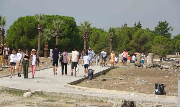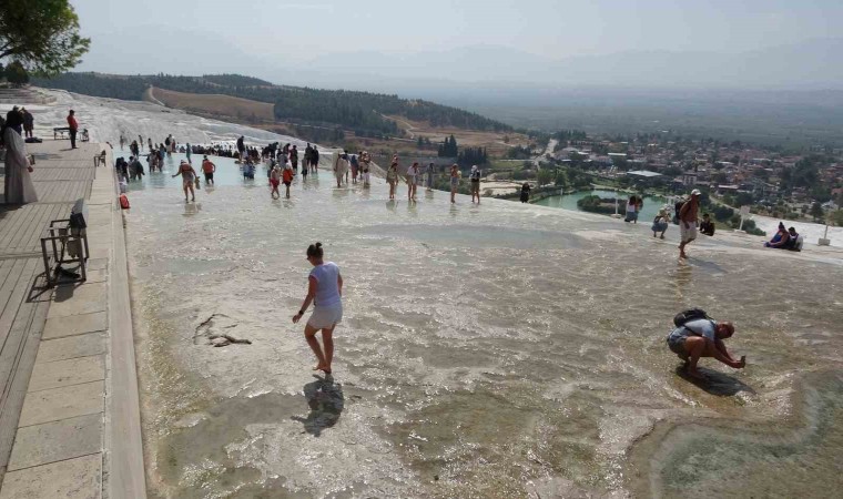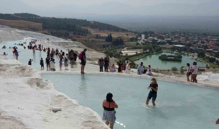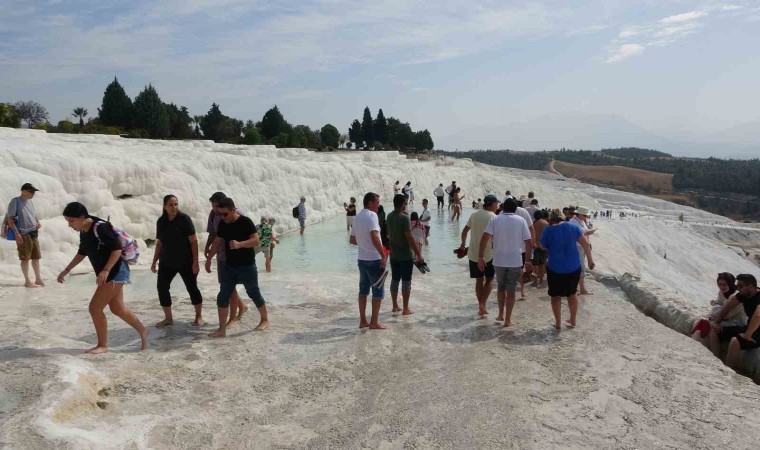 UNESCO Dünya Kültür Mirası Listesi’nde yer alan ve eşsiz güzelliğiyle “beyaz cennet” olarak nitelendirilen Pamukkale’de, sonbahar yoğunluğu yaşanıyor. Pamukkale’yi görmek için kilometrelerce uzaklıktan gelen yerli ve yabancı turistler, travertenlerin üstünde büyüleyici manzaranın tadını çıkartıyor. Şifalı termal suyun oluşturduğu travertenleri ve çevresindeki antik kentleri geziyor. Tarihi antik kentin giriş kapılarında yoğunluk oluşturan misafirler, dört mevsim sıcaklığı 36 derece olan antik suyun içinde yürüyor. Bazı turistler ise travertenler üzerinde çıplak ayakla yürüyüş yapıp cep telefonlarıyla fotoğraf ve video çekiyor. Beyaz travertenlerde hatıra fotoğrafı çektiren yerli ve yabancı konuklar, havuzlara girerek termal su ile çamurdan yararlanıyor. Misafirler ayrıca antik tiyatro ve tarihi mezarların olduğu yerleri de geziyor. Adrenalin tutkunu sporcular da Dinamit Tepe’den paraşütle atlayıp, manzarayı havadan izleme imkanı buluyor.