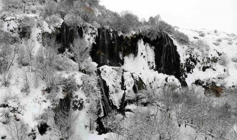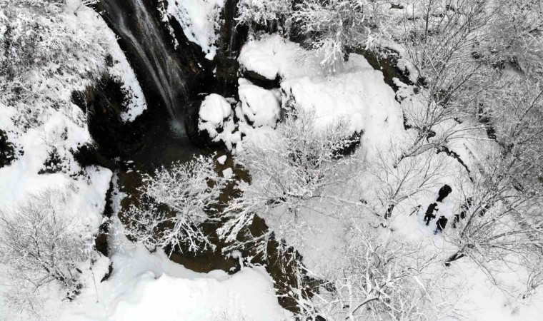 Kısmen donması nedeniyle buz sarkıtlarının da oluştuğu şelalenin beyaz örtüyle bütünleşmesiyle kartpostallık manzaralar oluştu.